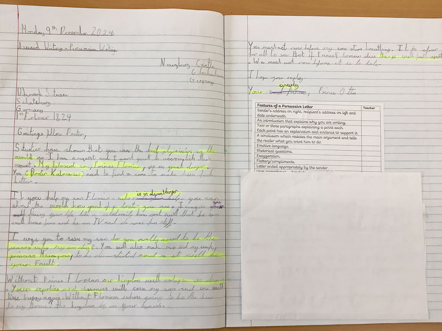 Year 5 children wrote persuasive letters based on the moral dilemmas in Clockwork by Philip Pullman. This activity helped them deepen their understanding of the story while improving their ability to write thoughtful and convincing arguments.